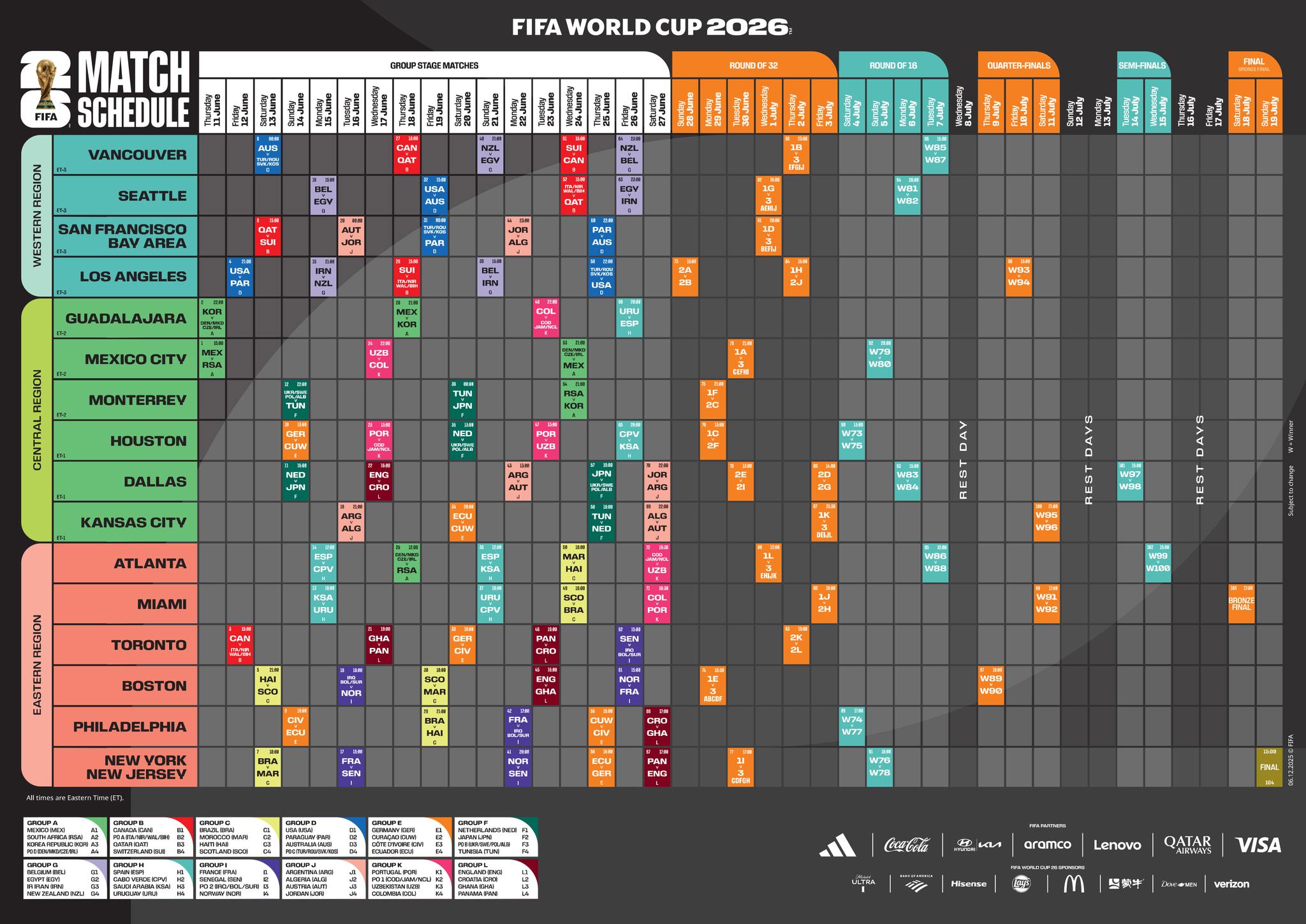 La FIFA a communiqué aujourd'hui l'horaire des rencontres de la phase finale de la Coupe du Monde 2026.