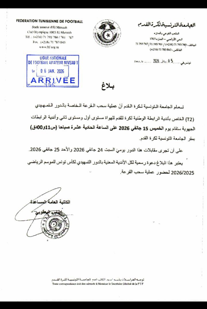 La cérémonie du tirage au sort aura lieu le jeudi 15 janvier à partir de 11h00 au siège de la Fédération Tunisienne de Football.