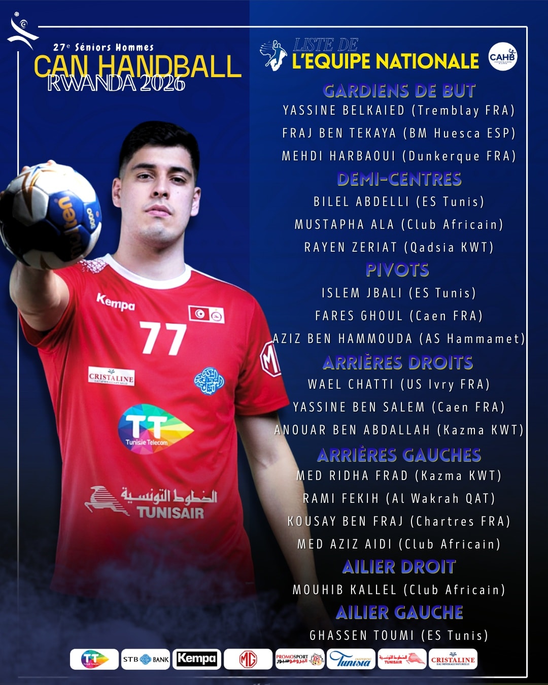 La Fédération Tunisienne de Handball a communiqué aujourd'hui la liste des joueurs appelés à disputer la phase finale de la Coupe d'Afrique des Nations 2026.