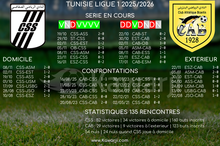 Avant les rencontres prévues ce mercredi pour le compte de la 16ème journée de Ligue 1 tunisienne 2025-2026, voici l'historique de ces confrontations en championnat :