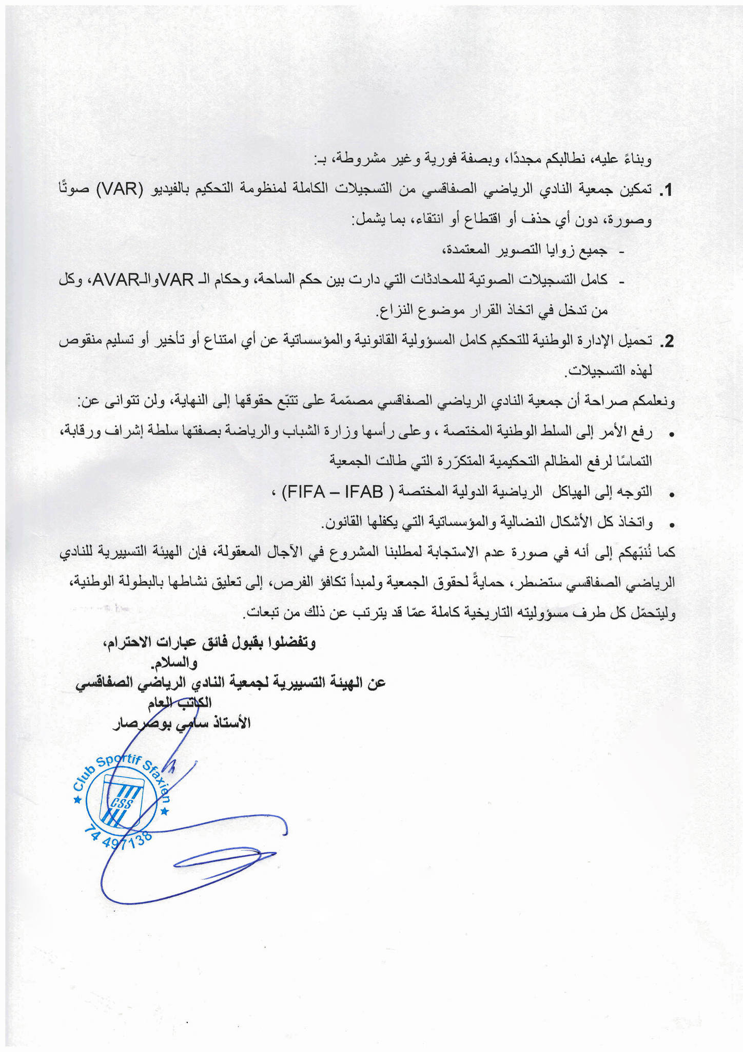 Le comité directeur du Club Sportif Sfaxien a publié aujourd'hui une correspondance officielle envoyée à la Fédération Tunisienne de Football et à la Direction Nationale de l'Arbitrage.
