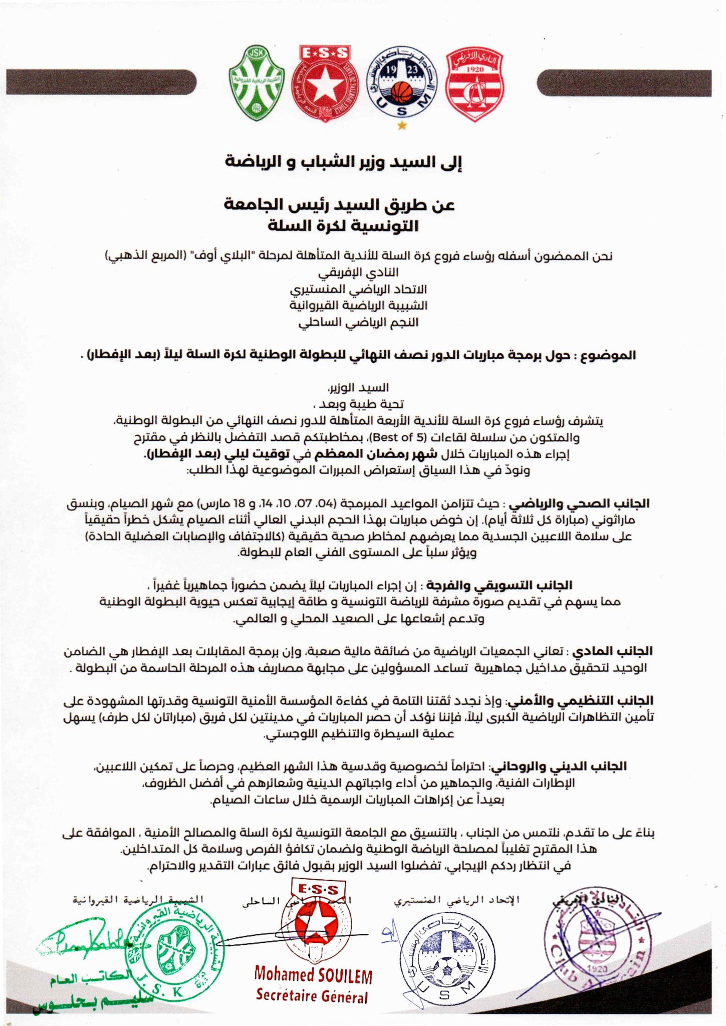 Le Club Africain, l'Union Sportive Monastirienne, l'Etoile du Sahel et la Jeunesse Sportive Kairouanaise, avec l'approbation de la Fédération Tunisienne de Basket-ball, proposent de disputer les demi-finales de Super play-off en soirée.