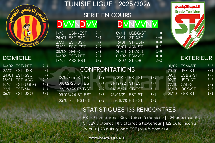 L1 25-26/J20 : Historique de la confrontation prévue ce samedi entre l'Espérance de Tunis et le Stade Tunisien