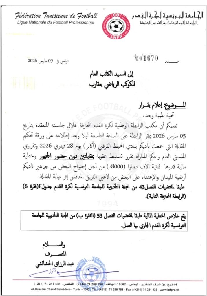 La Ligue Nationale de Football Professionnel a infligé aujourd'hui une sanction de huis clos contre l'AS Agareb.