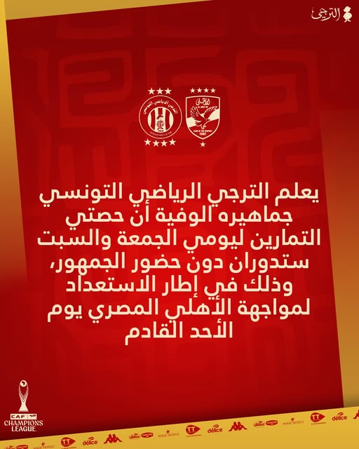 L'Espérance Sportive de Tunis a annoncé que les entrainements de l'équipe première auront lieu à huis clos aujourd'hui et demain.