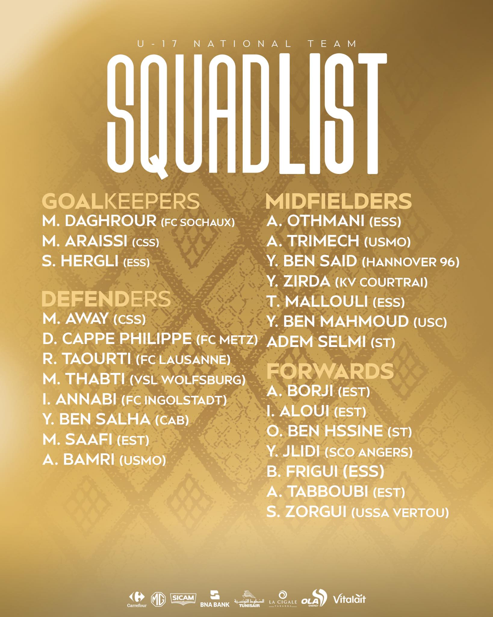 Le staff technique de la sélection tunisienne des moins de 17 ans a communiqué la liste des joueurs appelés à dispute les qualifications pour la Coupe d'Afrique des Nations U17.