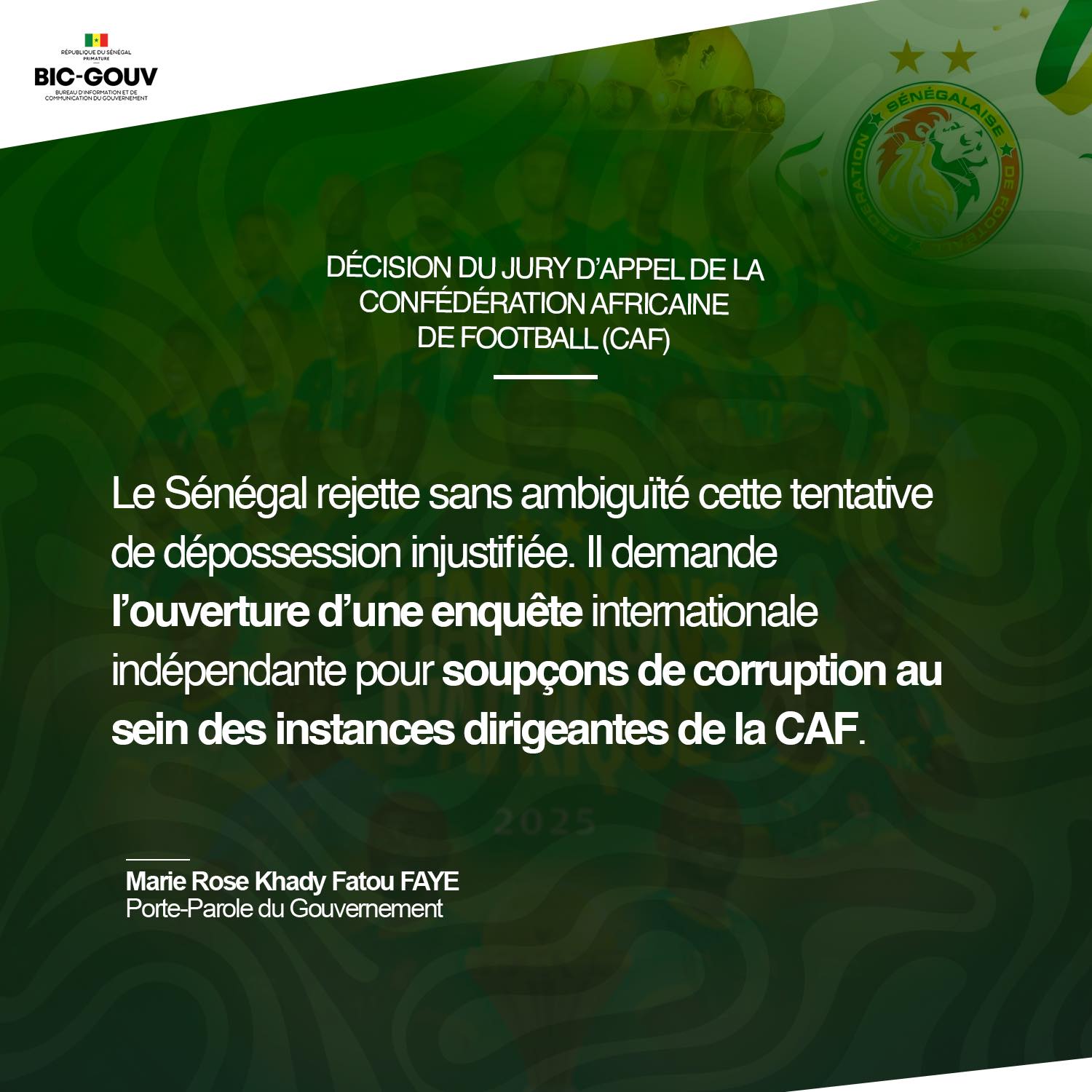 CAN 2025 : Le gouvernement sénégalais réagit à la décision du jury d'appel de la Confédération Africaine de Football et réclame une enquête internationale pour corruption