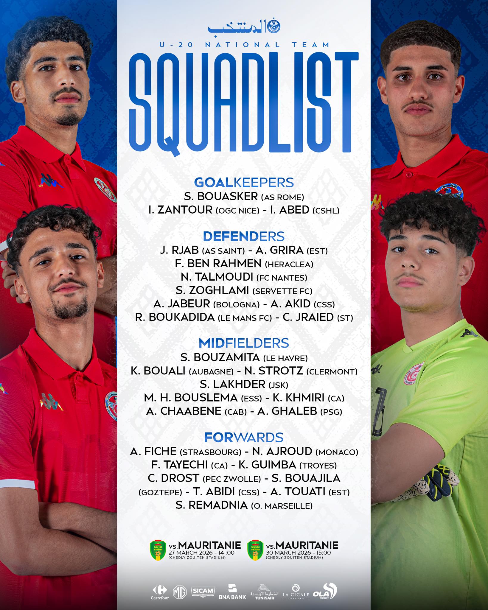 Le staff technique de la sélection tunisienne des moins de 20 ans a communiqué la liste des joueurs convoqués pour la double confrontation amicale face à la Mauritanie.