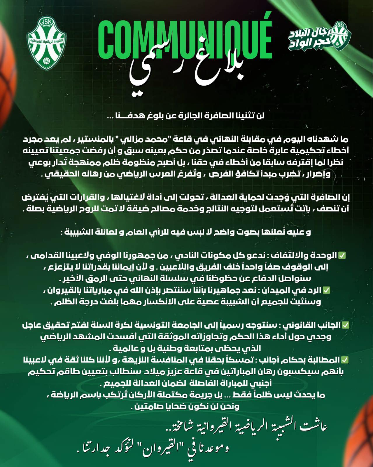 La direction de la JS Kairouanaise a par ailleurs affirmé sa détermination à défendre les intérêts du club, annonçant l’envoi d’une correspondance à la Fédération Tunisienne de Basketball pour demander l’ouverture d’une enquête.