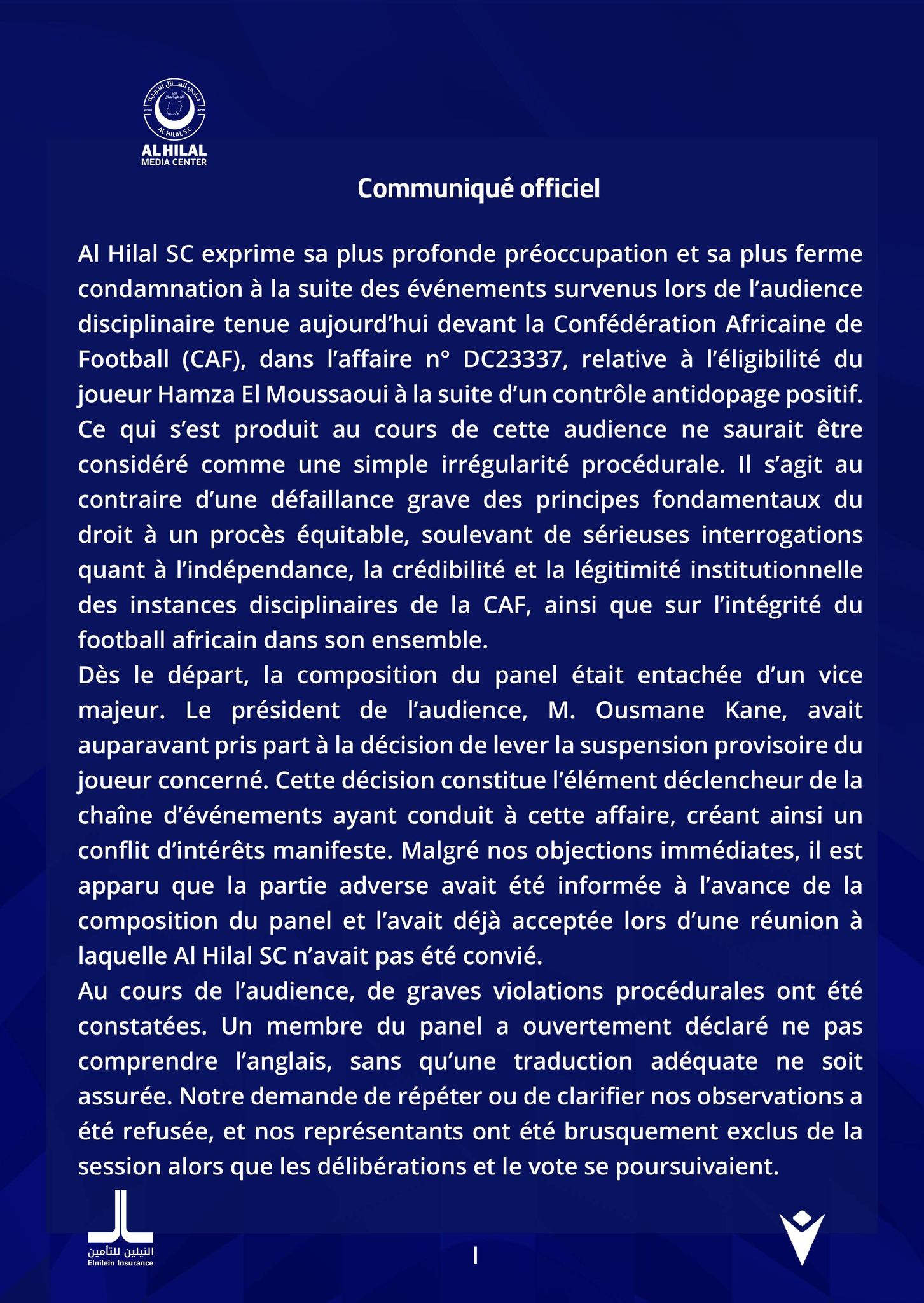 Le club soudanais d’Al Hilal a vivement critiqué le déroulement de l’audience disciplinaire tenue devant la Confédération Africaine de Football dans l’affaire liée à l’éligibilité de Hamza El Moussaoui.
