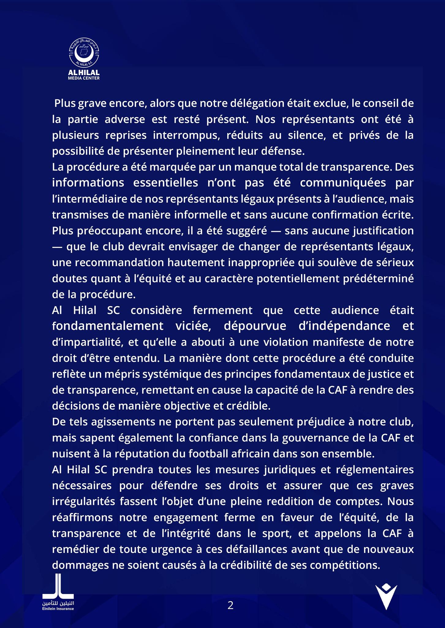 Al Hilal dénonce également plusieurs anomalies durant l’audience, dont des problèmes de communication, l’absence de traduction adéquate, ainsi que l’impossibilité pour ses représentants de défendre pleinement leurs arguments.