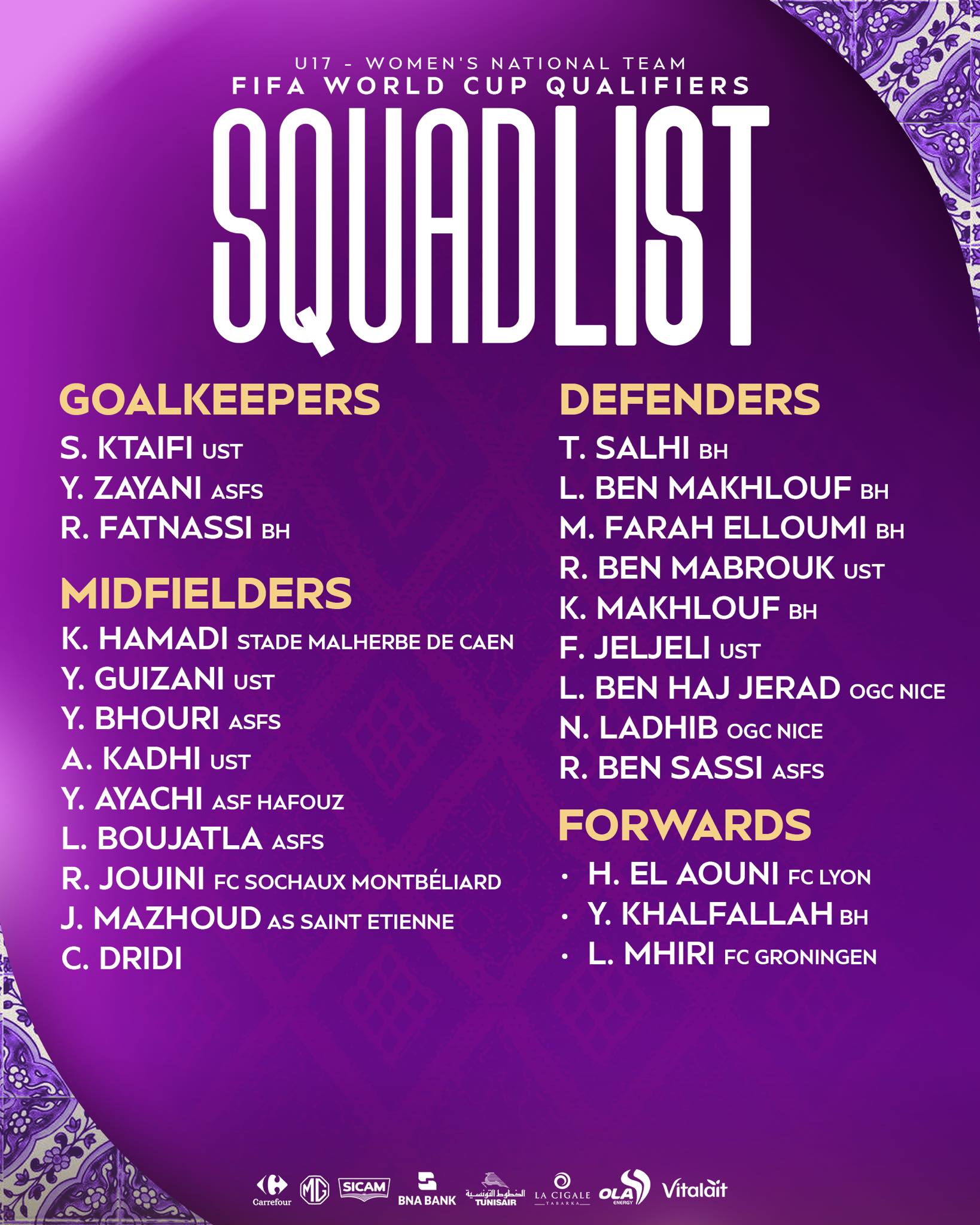 La Fédération Tunisienne de Football a communiqué la liste des joueuses de la sélection tunisienne féminine des moins de 17 ans qui disputeront les qualifications africaines de la Coupe du Monde féminine U17.